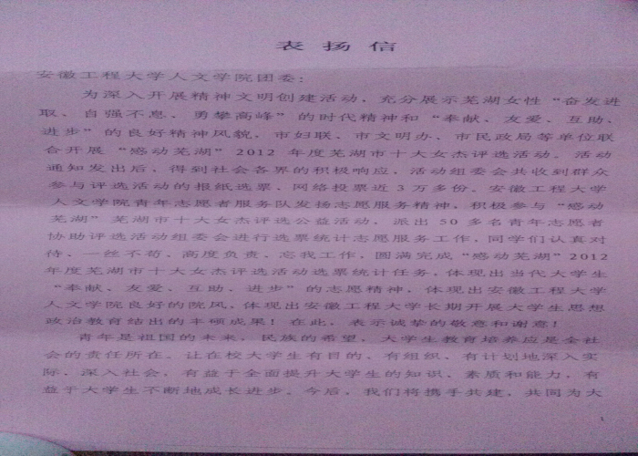 信中写道:安徽工程大学人文学院青年志愿者服务队发扬志愿者服务精神,积极参与“感动芜湖”芜湖市十大女杰评选公益活动,派出50多名青年志愿者协助评选活动组委会进行选票统计志愿服务工作,同学们认真对待,一丝不苟,高度负责,忘我工作,圆满完成“感动芜湖”2012年度芜湖市十大女杰评选活动统票统计任务,体现出当代大学生“奉献,友爱,互助,进步”的志愿精神,体现出安徽工程大学人文学院良好的院风,体现出安徽工程大学长期开展“三做”育人结出的丰硕成果!在此,表示诚挚的敬意和谢意!