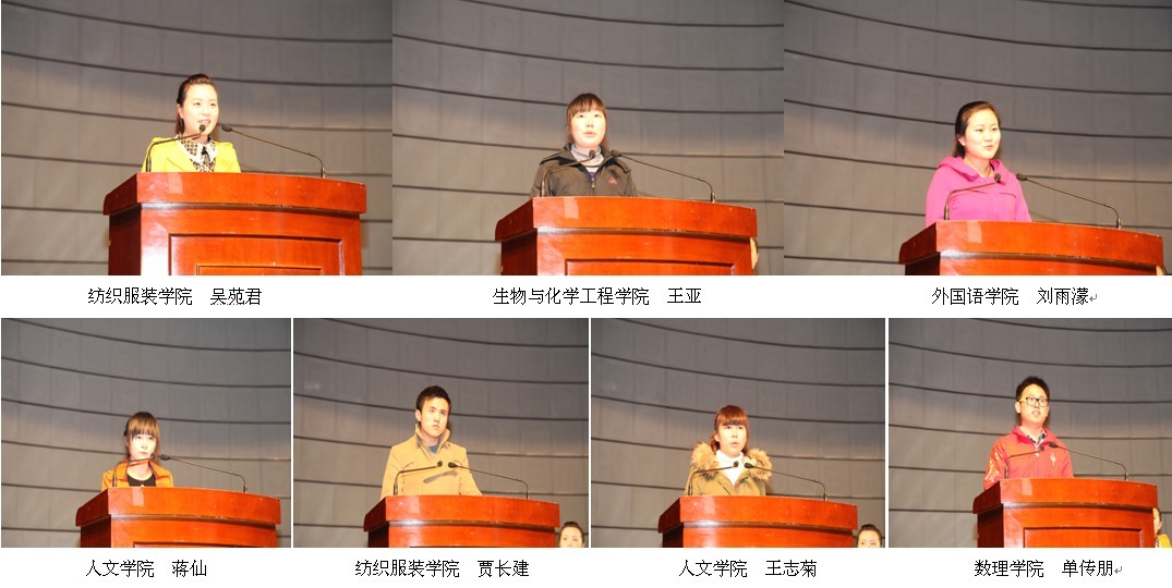报告会上,纺织服装学院服工101班吴苑君同学以《在心中每天开出一朵花》为题,讲述了自己如何走出刚入学时的自卑怯懦心理,分享了自己对于大学学习、生活的体会和感悟。生物与化学工程学院高分子102班王亚同学以《大学,我不是一个人在奋斗》为题,讲述了宿舍同学给予自己学习上的帮助和生活上的照顾,为大家诠释了友谊的力量。外国语学院英语092班的刘雨濛同学以《把兴趣化为学习的动力》为题,分享了自己是如何培养学习英语兴趣的,以及学习英语的心得体会。人文学院社工102班蒋仙同学以《追梦》为题,从学习、学生组织、课外竞赛和志愿服务四个方面分享了自己在大学的奋斗历程,展现了我校大学生全面发展、积极向上的精神风貌。纺织服装学院纺织091班贾长建同学以《成功在于坚持》为题,讲述了在大学如何不断地挑战自我、超越自我、完善自我,用实际行动诠释“坚持不懈,奋斗不止”的人生信条。人文学院社工092班王志菊同学以《知恩之心,感恩之行》为题,用自己的亲身经历呼吁大学生要知恩,更要感恩,要用实际行动来回报祖国、回报母校和回报亲人。数理学院统计102班单传朋同学以《态度决定一切,细节决定成败》题,讲述自己为追求梦想,不断尝试,大胆挑战的经历,告诉大家大学是人生腾飞的舞台,要争取机会、勇于突破。
