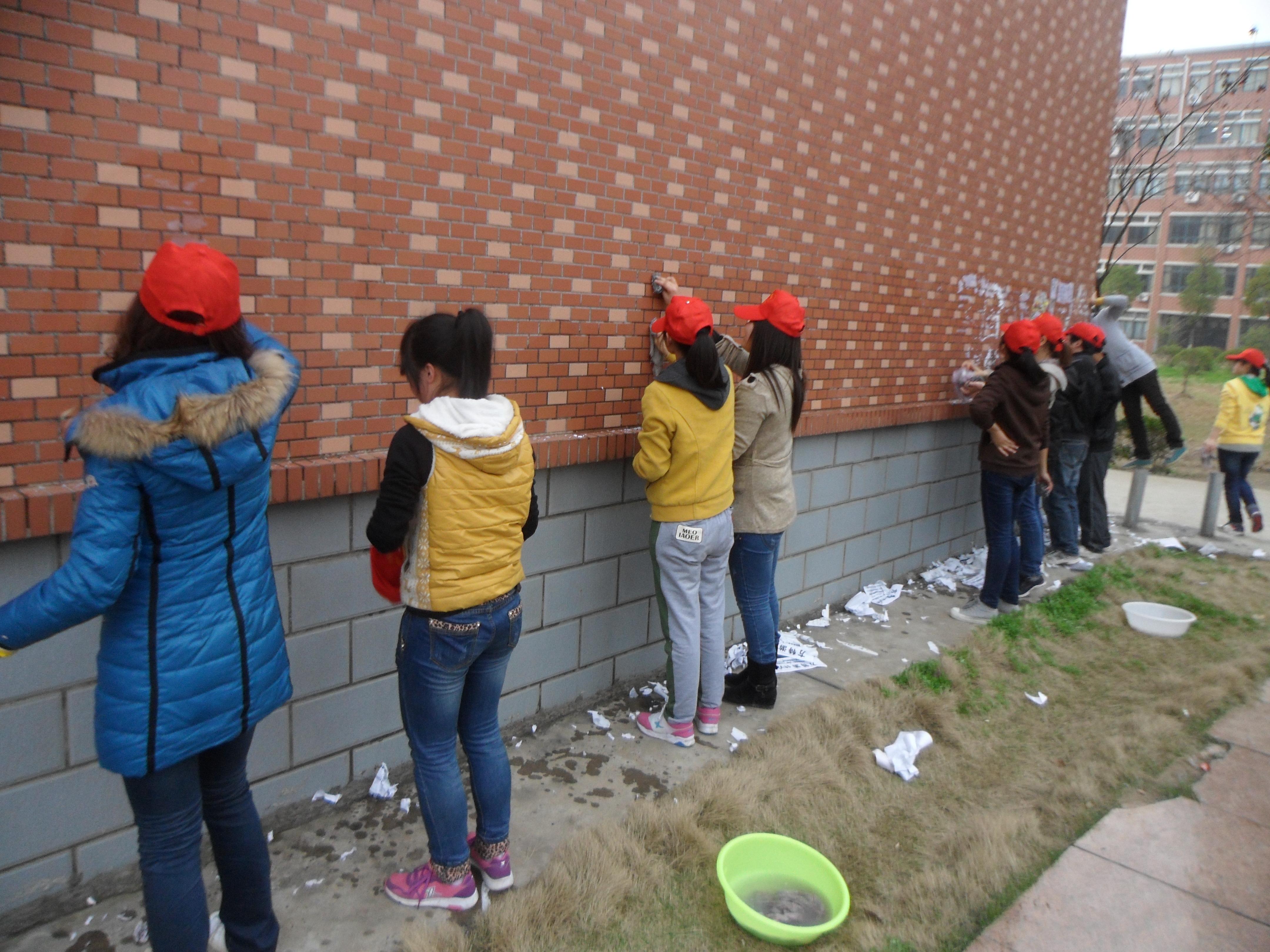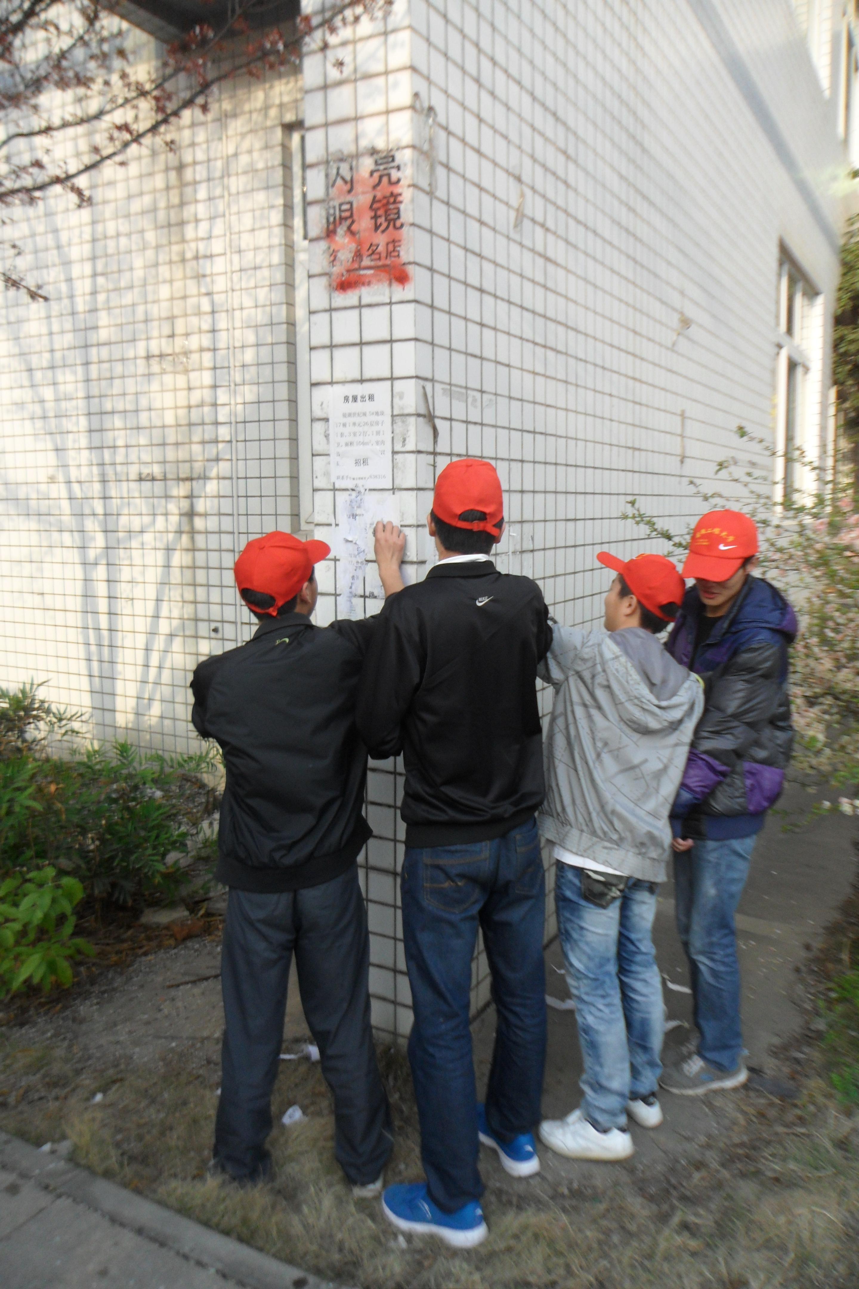 在“蝶恋花”爱校行动中,3月8日、15日和22日,外语学院志愿者们带着脸盆、抹布和刷子分三次对教学区的“小广告”进行了彻底的清理,并清洗了教学区的宣传栏。经过志愿者们的辛勤劳动,宣传栏和墙壁焕然一新,同学们衷的感到快乐,小小的善举,还墙壁一份洁净,也给心灵吹进一阵新风。