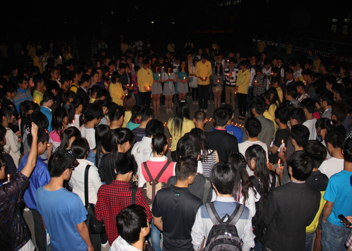 活动现场,一支支摆放在地上的蜡烛被点燃,亮起“雅安加油”的字样,现场两百多名同学也在工作人员的引导下依次点亮手中的蜡烛,组成“爱心”默默地为灾区人民祈福。此时现场响起了《和你一样》的旋律,全场人员集体唱起这首充满力量和满怀温暖的歌曲,向灾区人民传达着我们永远不离不弃的爱。随后,全体人员为灾区默哀一分钟。飘忽的烛光映在人们脸上,他们脸上满是凝重和悲伤。蜡烛在燃烧,爱心在传递,天桥顷刻变成了爱的海洋。在主持人满怀深情的祈福话语中,现场的气氛也达到了高潮,许多观众情不自禁的落下了眼泪,久久不愿离去。整个活动在庄重而又充满爱的气氛中结束。