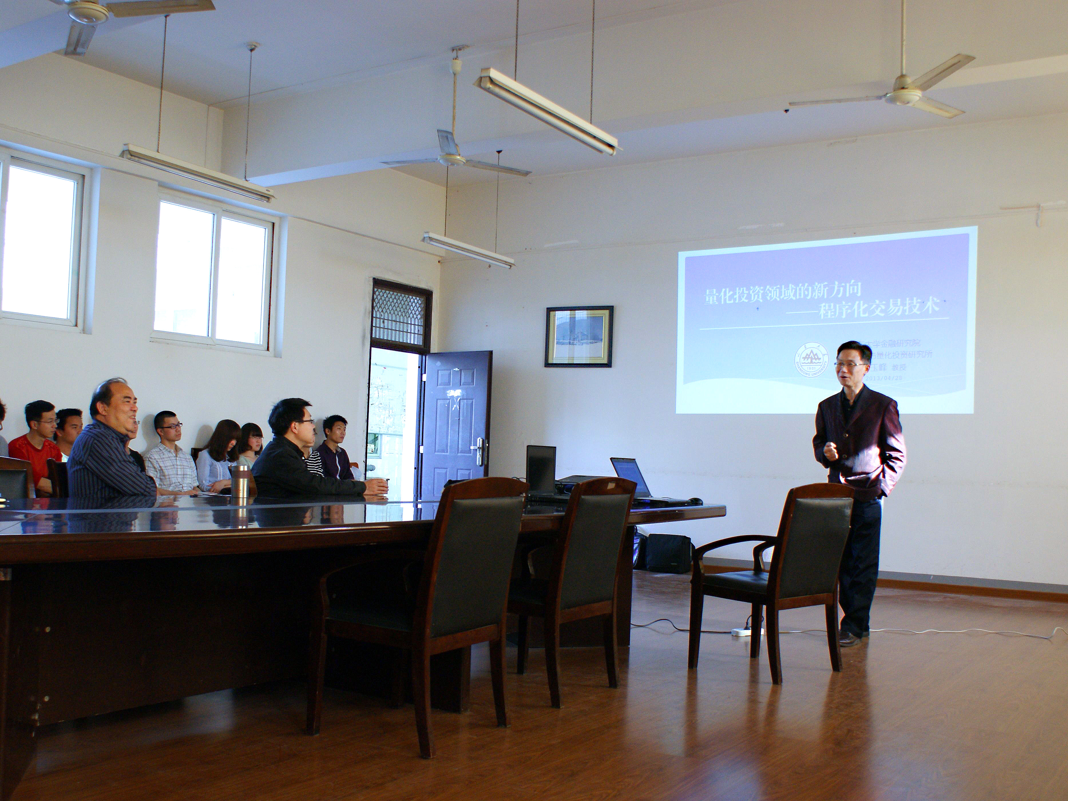 石教授用生动、活泼、风趣的语言,深入浅出的讲解了金融与数学的关系,将学生带入了金融数学与金融工程的科学世界。报告从炒股中引入量化投资的概念,进而进入程序化交易这一崭新的领域。程序化交易指设计人员将交易策略的逻辑与参数在电脑程序运算后,并将交易策略系统化。当趋势确立时,系统发出多空讯号锁定市场中的价量模式,并且有效掌握价格变化的趋势,让投资人不论在上涨或下跌的市场行情中,都能轻松抓住趋势波段,从而获得收益。石教授的课题组获得的程序化交易效果明显优于国外学者提出的AB交易程序。