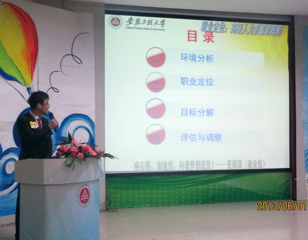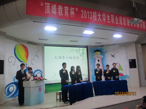 为帮助大学生树立正确的人生目标、就业观念以及合理规划自己的未来,由校学生处(毕业生就业指导中心)和校团委主办,机械与汽车工程学院承办的“顶峰教育杯”2013校大学生职业规划设计大赛决赛于6月1日上午在学术报告厅隆重举行。担任本次大赛的评委有芜湖市人才交流服务中心主任刘兴荣,顶峰教育集团董事长夏云兴,东旭光电副总经理李晓波,以及学生处负责人和相关专家。出席本次比赛的还有校团委、机械与汽车工程学院的相关负责人。