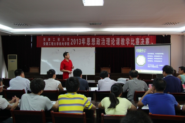 校首届思想政治理论课教学比赛是根据《中共安徽省委教育工委关于开展高校思想政治理论课教学比赛活动的通知》精神,并依据校教字﹝2013﹞29号《关于举办2013年校思想政治理论课教学比赛的通知》要求组织实施。此次活动得到校党委书记陈其工、校长干洪、副书记方友实等领导的高度重视和积极支持,并对活动的开展给与直接指导。
