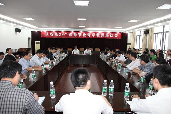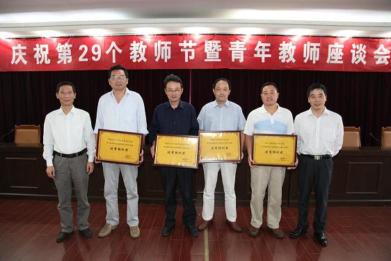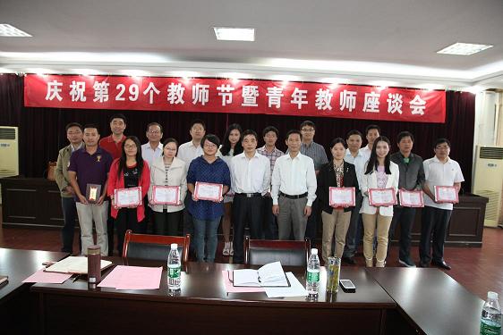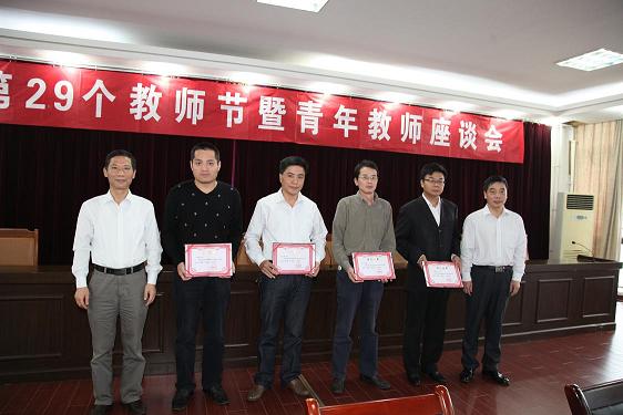 李震宣读了省级青年教师基本功竞赛、校青年教师职业规划大赛、校青年教师优秀论文的获奖者名单,刘宁、李震和人事处、教务处、科技处、工会的负责同志一起为获奖单位和个人颁奖。在接下来的两个多小时的交流中,三位获奖者教师代表和与会老师们围绕“立德树人,同心共筑中国梦”的教师节主题纷纷发言,或谈及自己初来校时及工作中的感受,或交流治学从教的经验心得,对学校给予自己教学科研工作的关心和支持表示感谢,并对学校有关工作提出了许多建设性的意见和建议。