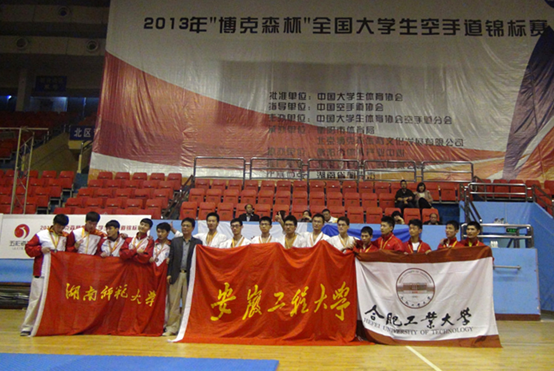 近日,2013年全国大学生空手道锦标赛在湖南省衡阳市落下帷幕。我校空手道队在教练员胡昌领的带领下不畏强手,顽强拼搏,勇夺个人三金两银和团体金牌的骄人战绩,为我校增光添彩。
