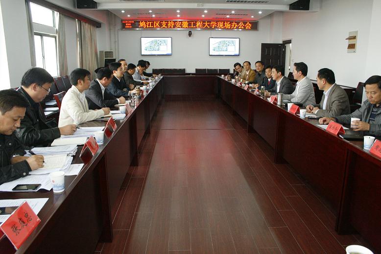 刘宁校长代表学校对鸠江区领导一行表示欢迎和感谢。他简要介绍了学校建设发展的情况和学校学科专业特色与鸠江区产业结构的密切关联,回顾了学校在深度融入地方经济建设方面取得的成绩,表示学校将在人才培养、科技合作、文化产业等方面积极支持鸠江区的建设,积极融入鸠江区“建成支撑芜湖、引领皖江的商务中心区、产业转型示范区、跨江发展先行区、文化魅力新城区”的发展目标,共建芜湖市的东区繁荣。同时,他也希望鸠江区继续加大对学校发展的支持力度,帮助解决制约学校发展的相关瓶颈问题。