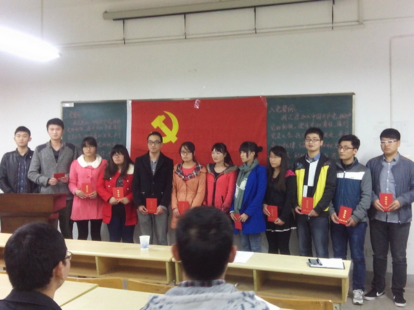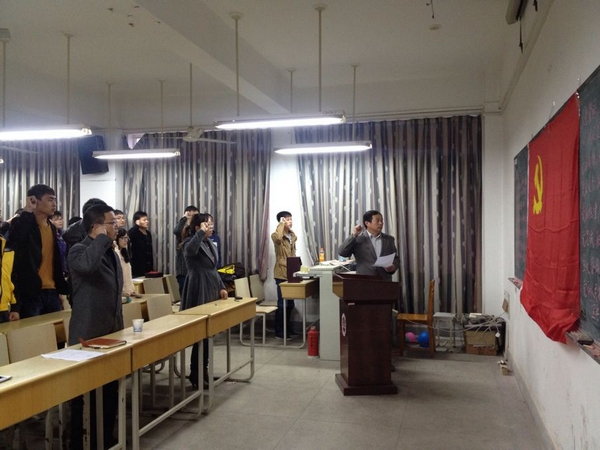 入党宣誓仪式开始,周毅仁宣读参加宣誓的入党人员名单,邬海量带领全体党员面向党旗庄严宣誓。参加入党宣誓的党员精神饱满,誓言铿锵有力,表达了为党的事业、为共产主义的远大理想贡献自己一切的决心。高强代表参加入党宣誓的新党员发言,他表示要以党员标准严格要求自己,不断加强理论学习,增强党员意识,遵守党纪国法,发挥好党员的先锋模范作用;同时要认真学好专业知识,为实现“中国梦”努力奋斗。