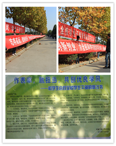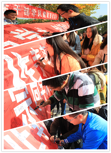 在签名活动现场,校学生会正式向全校学生组织和学生干部发出了《致全校学生干部的倡议书》,号召广大学生干部积极投身优良学风创建活动之中,以实际行为承诺:志存高远,勤勉奋进,为全校同学树立理想信念作表率;以学为主,兼学别样,为全校同学端正学习态度作表率;规划大学,启航人生,为全校同学确立学习目标作表率;引领示范,严以律已,为全校同学遵守学习纪律作表率;崇尚学术,创新创业,为全校同学共创优良学风作表率;从我做起,服务同学,为全校同学健康成长成才作表率。