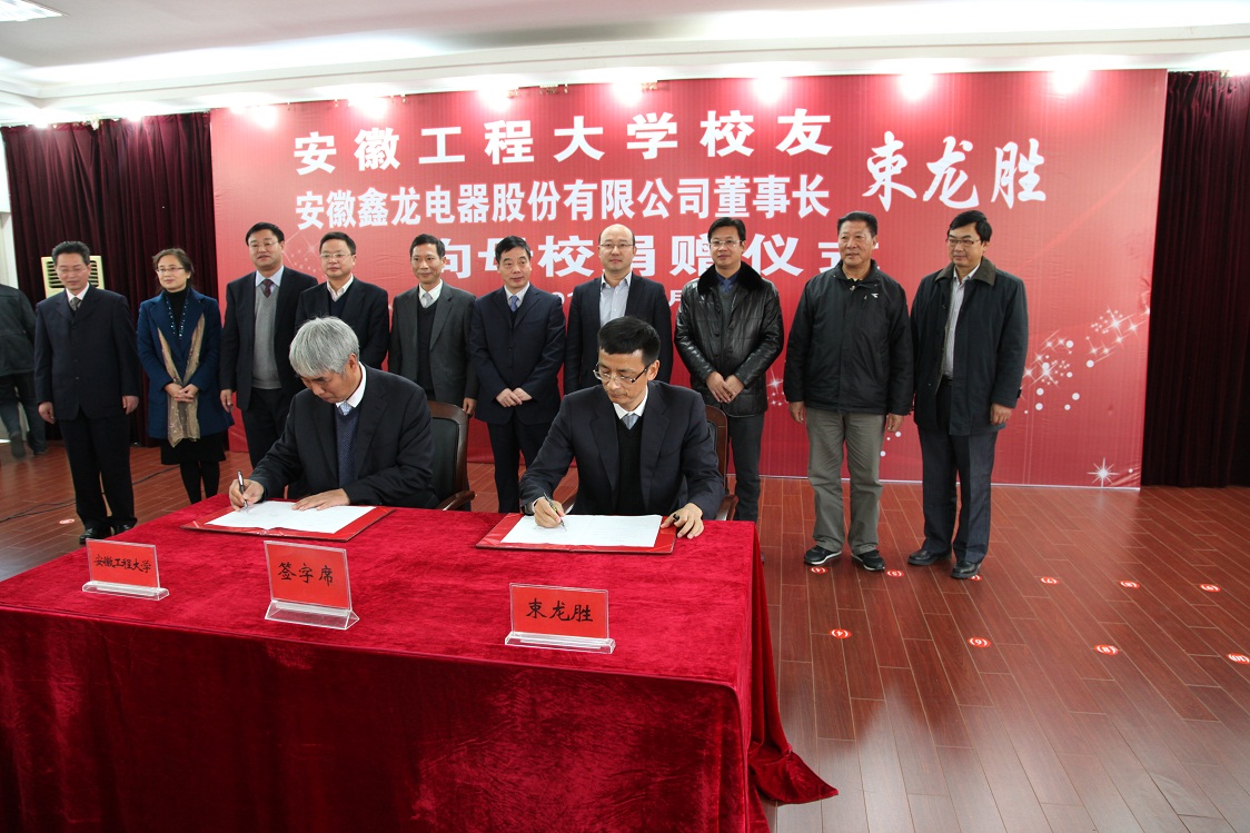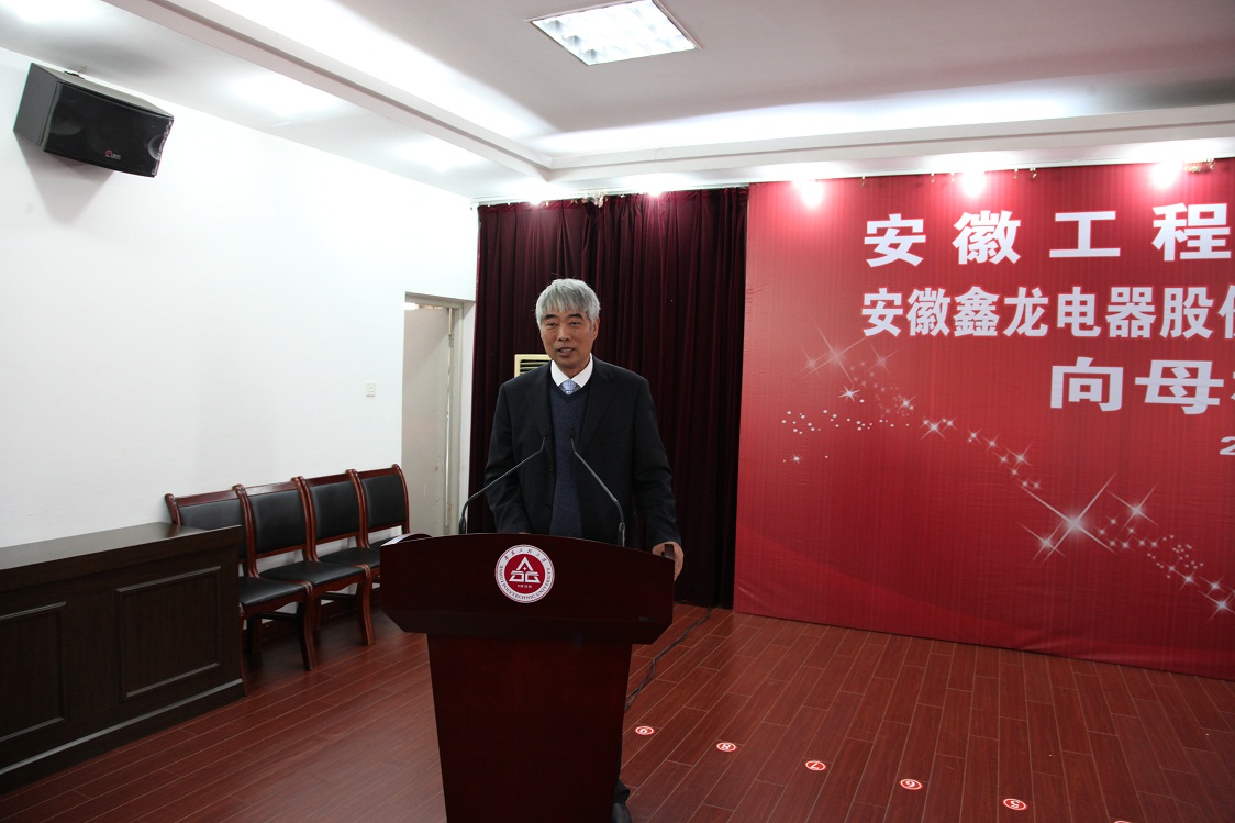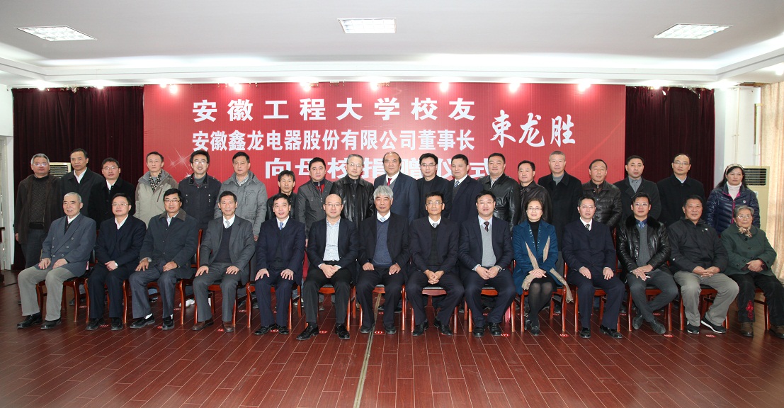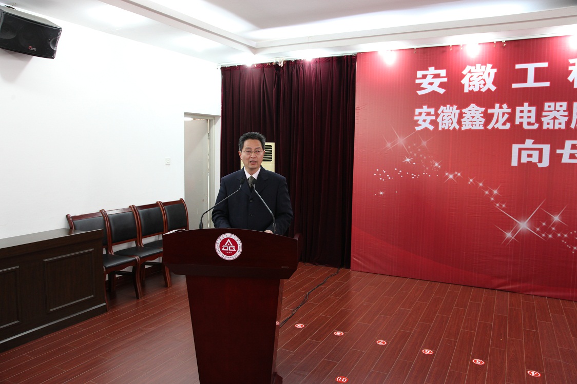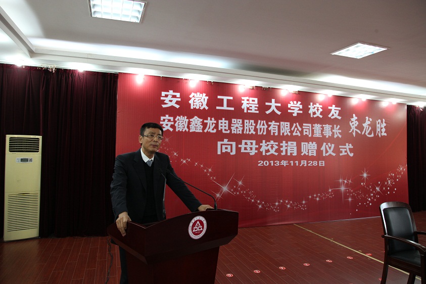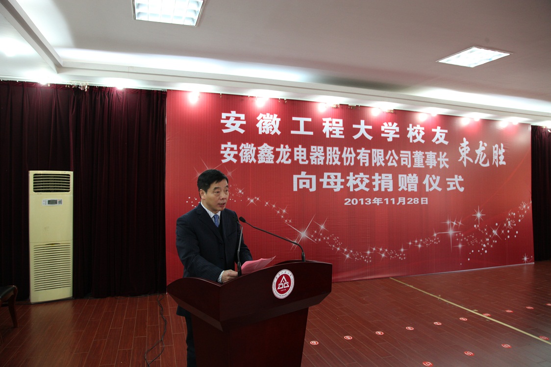 11月28日上午,学校在A座1314会议室举行杰出校友、安徽鑫龙电器股份有限公司董事长束龙胜向母校捐赠仪式。应邀出席捐赠仪式的有芜湖市人民政府副市长汪华东,鑫龙电器股份有限公司12名高管,安徽工程大学党政领导班子成员、老教师代表、电气工程学院和职能部门负责人及学生代表。副校长郭兴众主持捐赠仪式。