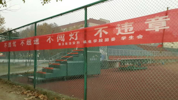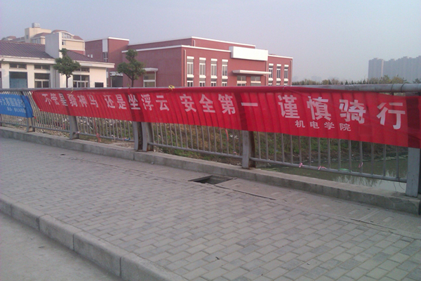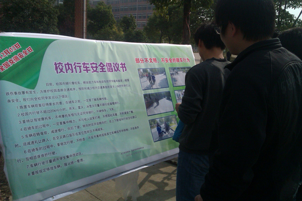 首先,由机电学院团委、学生会牵头向全校同学发出了校内骑行安全倡议书,在校内主要交通路口悬挂标语横幅,提醒广大同学时刻注意交通安全,并联合校保卫处治安科一起制作了宣传展板,以图文并茂的形式进一步警示广大师生同学,希望大家牢记安全的重要性,从自身做起,安全、文明骑行。