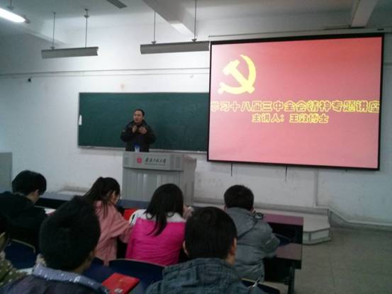 12月5日下午,生物与化学工程学院分党校、研究生部分党校学习和贯彻十八届三中全会精神专题讲座举行。本次讲座由思想政治理论课教学部王效博士主讲,旨在使党校学员深入了解十八届三中全会精神,在学习、实践中全面贯彻十八届三中全会精神。