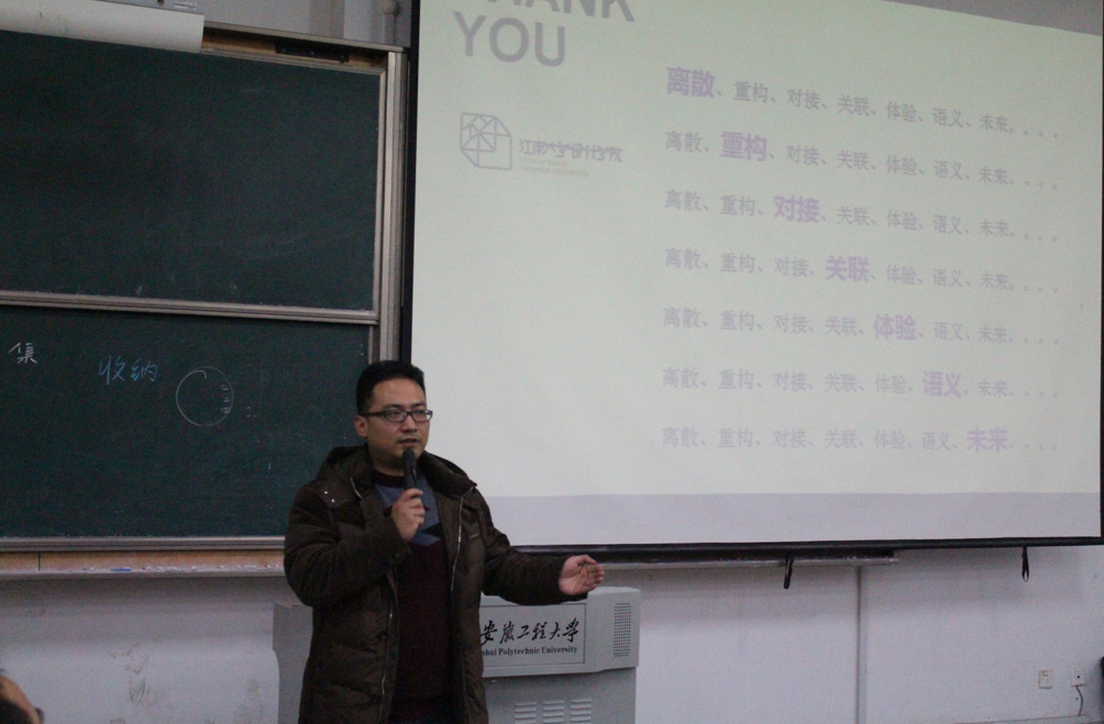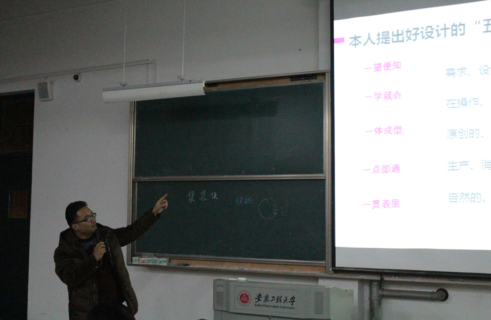 熊微博士围绕“怎样才算好设计”的主题,从“设计改变生活,设计创造价值”的角度入手,深入剖析了好设计的概念。同时,他带领全场师生回顾了前现代、现代、后现代的设计发展历程,将设计的阶段性目标精辟概括为前端做人、中端做事、后端做物、末端做钱。最后,他通过十个案例解析,概括出好设计的“五个一”标准:一望便知、一学就会、一体成型、一点即通和一贯表里。他鞭策同学们要学会运用巧妙对接、离散重构、多重语义、思维完形等多种设计方法,并强调设计过程中的可理解性、易用性、交互性、关联性及文化性等要求。熊微博士以渊博的知识、诙谐的语言赢得了全场师生的阵阵掌声。
