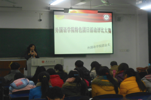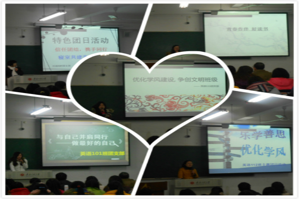 活动现场,来自各班级的团干代表依次上台用PPT展示详细汇报了班级团日活动的开展情况,带领大家重温了各班团日活动的疯狂、感动和魅力。经过评委们的慎重考虑,结合各团支部团日活动申报材料、可行性、创新性、效果以及各代表现场答辩等几个方面进行了综合严格的评审后,获得本学期“特色团日活动”称号的团支部为:英语111班团支部、英语122班团支部、日语111班团支部、英语(升)131班团支部和英语132班团支部。