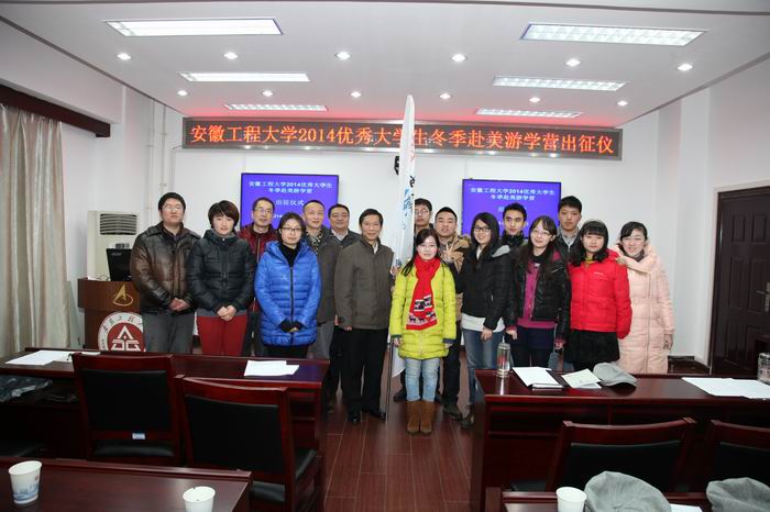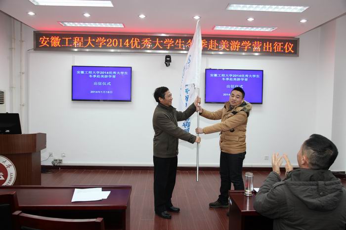 最后,雷中祥从李震手中接过“安徽工程大学2014优秀大学生冬季赴美游学营”营旗。出征仪式在一片热烈的掌声中结束。