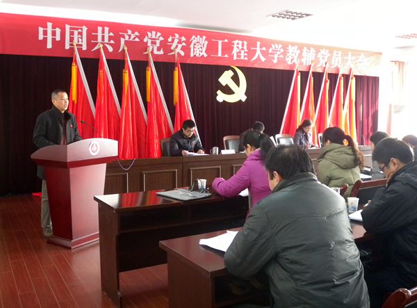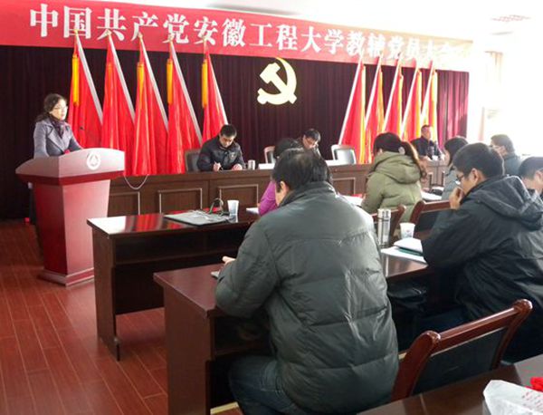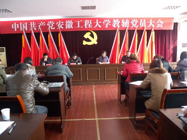 2014年1月14日,中共安徽工程大学教辅党员大会隆重召开。总支37名(其中预备党员2名)党员参加了大会。校党委常委、副书记苏国红同志出席大会并讲话,校党委常委、组织部部长郑健同志到会指导工作,上一届总支委员会委员徐军、余雷出席会议并在主席台就坐。大会由徐军同志主持。