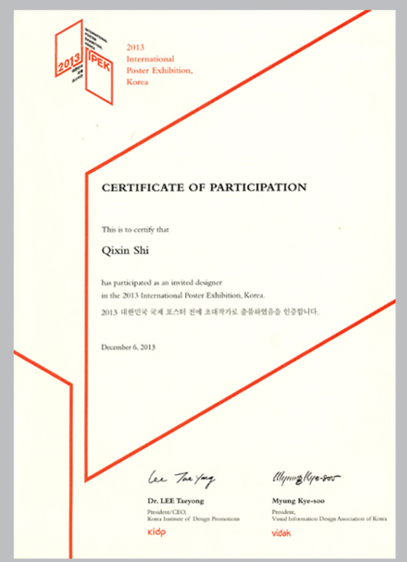 艺术学院史启新副教授的海报作品《汉字时光》受邀入展“2013韩国国际海报展”(2013 International Poster Exhibition, Korea)国际海报邀请展单元,于2013年12月在韩国设计中心展出。该展由韩国设计振兴院主办,韩国平面设计协会协办,展览主题是“海报,历史、文化产业与技术的交叉点”。