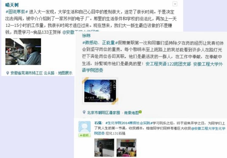 在2014年寒假中,我校广大同学通过民俗体验、情亲感悟,社会调查与观察,志愿服务与兼职等多种形式,积极参与社会实践活动,通过微博、微信等新媒体平台,晒实况,晒心得,晒感动,晒收获,并@学校团属微博和好友微博,及时与其他同学交流分享,度过了一个精彩、有意义的假期。