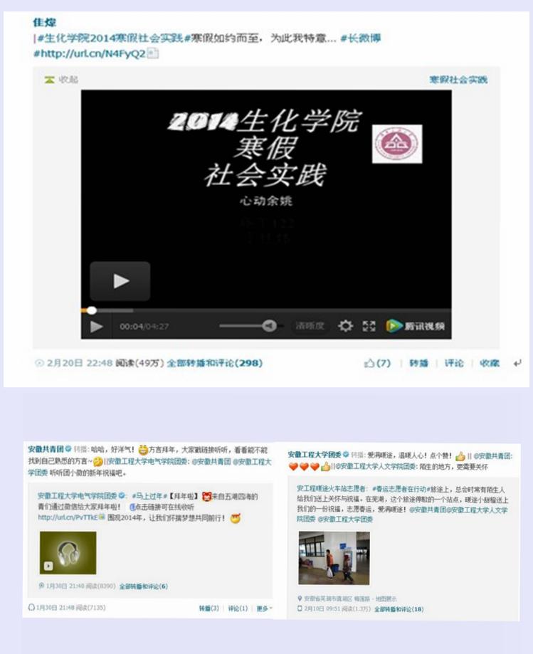 生化学院丁佳炜同学将家乡余姚的特色景点和风土人情民俗等制作成视频《心动余姚》发到微博上,短短两天时间阅读量就突破了49万。赴美游学营的同学及时将在美游学情况通过网络发回国内,与同学们分享他们的异域见闻。电气学院团委微信管理团队的小编们还专门制作了“方言拜年”音频,上传到院团委微信、微博平台上,阅读量超过8000,“安徽团省委”对此评价“好洋气”。人文学院志愿者在微博上分享参与芜湖火车站春运志愿服务情况,阅读量超过1.3万,受到“安徽团省委”点赞支持。