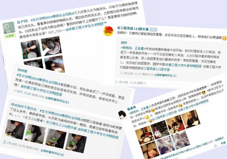 生化学院团委积极组织开展“微实践”活动,引导学生在家做饭、做家务、组织亲情团聚、为长辈做一件有意义的事,以微活动创造微感动,体验家长艰辛,感悟亲情温馨,共收到微博970条,阅读量达82万人次。如江户川同学为奶奶洗头发、织围脖,徐钟媛同学通过兼职获得的薪水为爸爸买了一件新衣服等等,都通过微博及时晒出,在微博上形成一股感动的暖流。外国语学院团委还组织开展了“微感动,正能量”微博征集活动,引导同学们利用寒假,寻找身边感动,定格温暖瞬间,传递青春正能量。