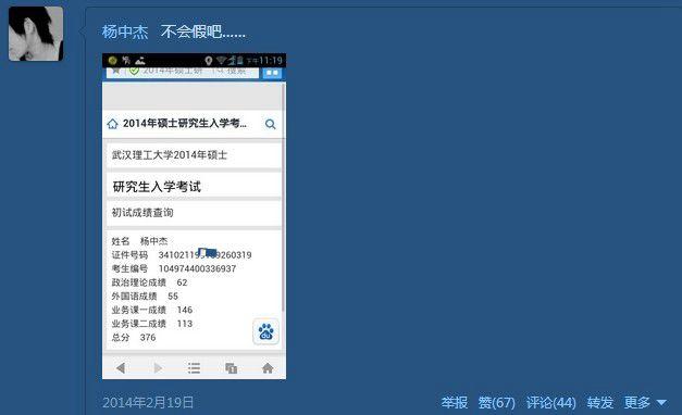 临近开学时,CET4和考研成绩陆续揭晓,团属微博、微信和QQ说说等网络平台上掀起了一股晒分数,晒惊喜的高潮。取得理想成绩的同学,还积极与同学好友交流互动,传授应试心得和经验体会。上届校学生会主席团四位同学考研均取得优异成绩。原校学生会主席杨中杰同学在网上晒出总分376、数学146分的成绩后,在广大同学中特别是学生干部中引起强烈互动,树立了学生干部正确处理工学关系,强化学风自律的良好形象。