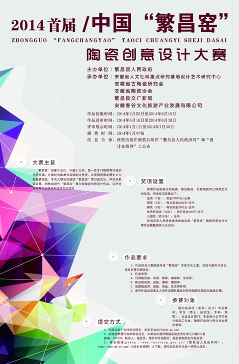 由安徽省繁昌县人民政府主办、安徽省人文社科重点研究基地安徽工程大学设计艺术研究中心策划并承办的2014首届中国“繁昌窑”陶瓷创意设计大赛,已于2014年2月25日开始面向社会征集作品。
