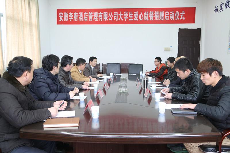 “爱心就餐计划”作为学校“团百花”学雷锋活动的一个项目,得到了安徽李府酒店管理有限公司大力支持。捐赠仪式上,校伙管会学生干部汪歆首先介绍了大学生爱心就餐计划的策划和前期筹备情况。校团委书记刘一与安徽李府酒店管理有限公司董事长辛国芳签订捐赠协议并接交了爱心餐劵9000份,共价值7.2万元。辛国芳董事长在会上表达了支持爱心就餐计划的初衷和接续开展爱心就餐活动的意愿。校后勤集团总经理魏长顺感谢李府公司的支持,充分肯定了伙管会学生干部的工作成绩,并介绍了全校餐饮服务、饮食安全、食堂发展等有关情况。