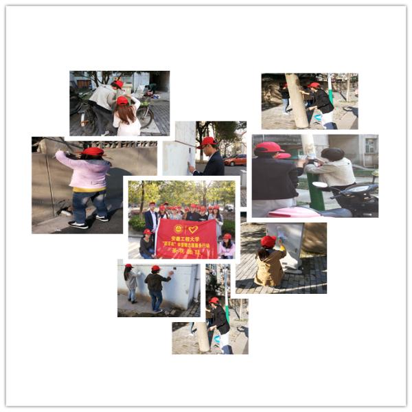 为营造一个洁净良好的校园环境,加大宣传人文校园的环境理念。3月15日,“茶花”志愿服务队来到安徽工程大学教工宿舍区开展小广告清理活动。4小时的活动中,同学们细致认真地清理垃圾和小广告。志愿者们的辛勤劳作,不仅美化了校园环境,而且提升同学们的文明意识。