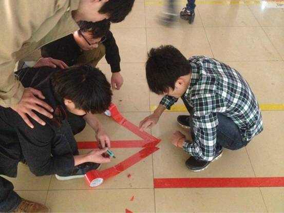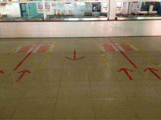 针对食堂就餐高峰时段,打饭拥挤混乱等情况,志愿者们精心设计,在地面上用醒目的胶带贴出就餐排队导向线,指引同学有序排队打饭,文明就餐。