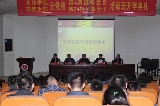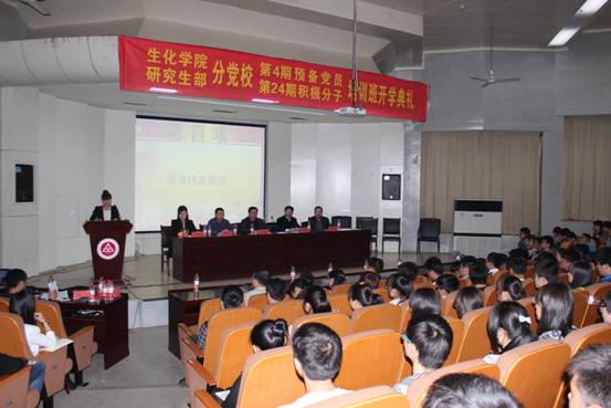2014年3月27日下午,学术报告厅座无虚席,生物与化学工程学院分党校、研究生部分党校第四期学生党员培训班暨第二十四期入党积极分子培训班开学典礼在此举行。校党校常务副校长、校宣传部部长孙浩然、研究生部党总支书记朱文藻、生化学院党委副书记章兵、生化学院党委委员、副院长陶玉贵莅临现场,参加开学典礼的还有学生各党支部书记,112名预备党员和179名入党积极分子。