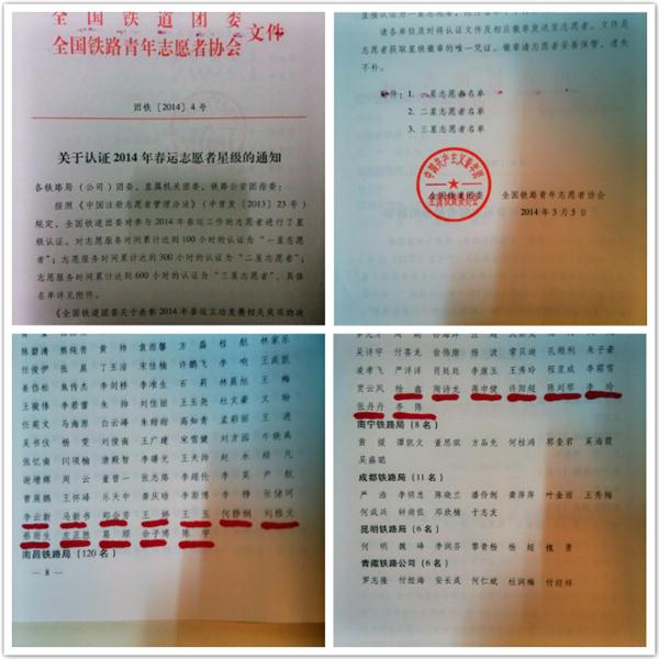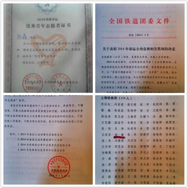 2014年春运期间,全国铁道团委开展了立功竞赛活动,对一批先进集体和个人进行了表彰。安徽工程大学人文学院杨鑫同学连续三年在芜湖火车站参与春运志愿服务,宣传志愿精神,践行志愿服务理念,评为“2014年全国铁路春运优秀青年志愿者”;李云新等12名志愿者服务时间达到100小时被评为“一星志愿者”,杨鑫等8名志愿者服务时间累计达到300小时被评为“二星志愿者”。