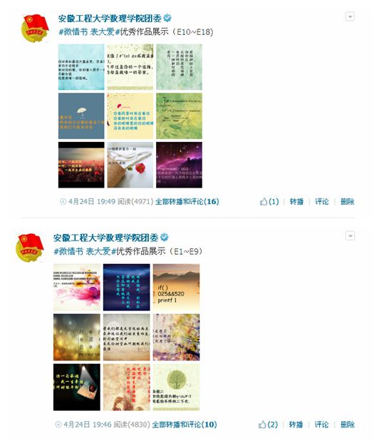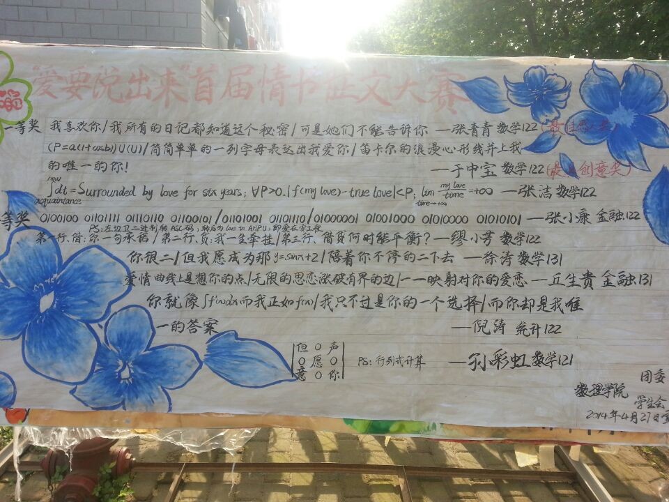 4月7日—4月20日,数理学院开展了首届“爱要说出来—浪漫数理”三行情书微博征集活动。此项活动得到了广大同学的热烈响应,共收到作品一百多份。