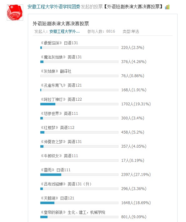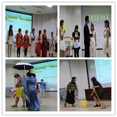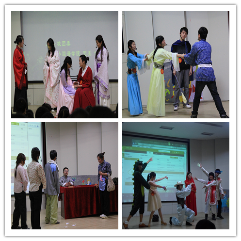 决赛当晚,来自不同学院不同年级的13支参赛队伍倾情上演了一幕幕或幽默风趣或感人至深的外语短剧,为大家奉上了一场精彩绝伦的视听盛宴,活动现场气氛热烈,座无虚席。《灰姑娘》、《悲惨世界》、《红楼梦》、《牛郎织女》、《雷雨》、《天鹅湖》、《皇帝的新装》、《仲夏夜之梦》……故事题材囊括古今中外、历史名著、童话故事、音乐剧、经典戏剧;一个个大家耳熟能详的故事被同学们用外语的对白或唱词演绎得淋漓尽致,不仅展示了外语语言的魅力,同时也带来了艺术感染,赢得了观众们的阵阵掌声。同时,比赛还在学院团委的官方微博中同时进行微直播,并设置了最佳网络人气奖,观众们在领略艺术魅力的同时,纷纷拿起手机为自己喜欢的队伍投上了宝贵的一票。