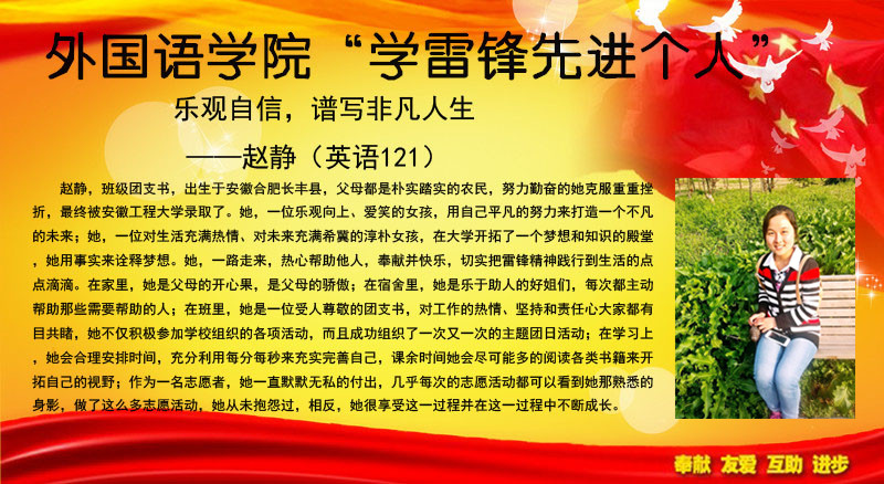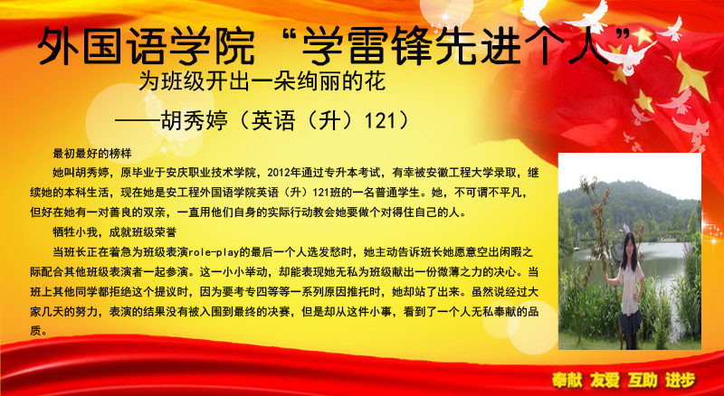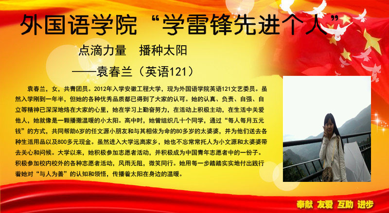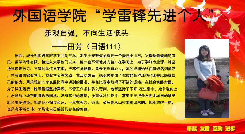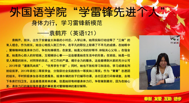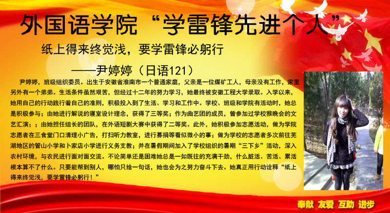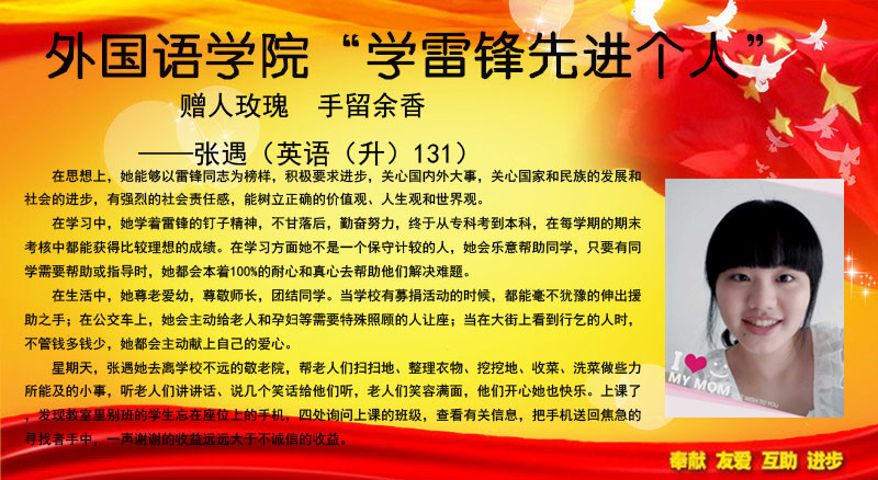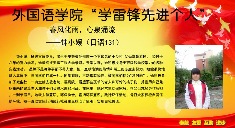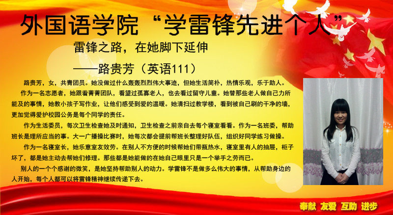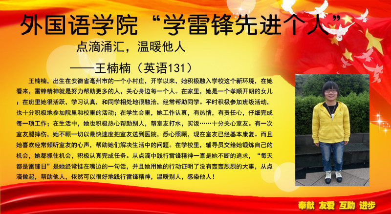 外国语学院自3月份开展“团百花”学雷锋志愿服务活动以来,各班级、各团支部积极组织、开展活动,志愿服务活动已渗透进生活的方方面面,在学生身边也涌现出许多活雷锋,体现了年轻大学生新时代的精神风貌。为更好地弘扬雷锋精神,经同学们的推选,发掘了一批真实、鲜活、感人的雷锋式人物和事例。他们就是我们熟悉的同学,生活中平凡的“小人物”,是他们用自己的一言一行给我们带来了“大感动”,是我们学习的标兵。
