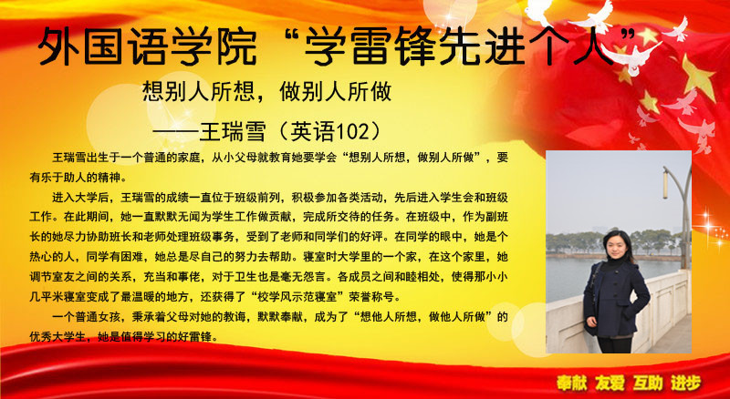 为表彰“学雷锋先进个人”,现将他们的事迹进行展示。希望广大同学能学习他们身上闪光的点点滴滴,并通过向他们学习,带动周边更多同学学雷锋,使雷锋精神成为一种时代的精神风貌,让雷锋精神永远传承下去,成为中华民族的精神财富。