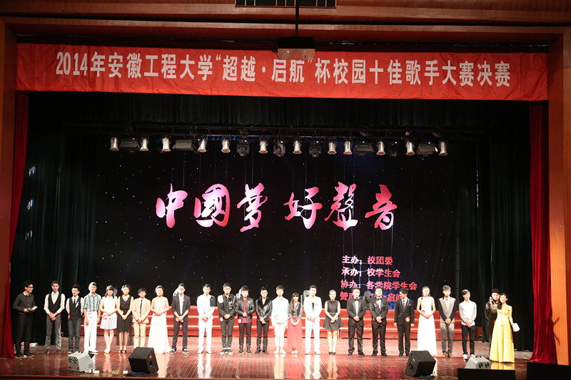 为梦想,齐聚舞台;为青春,献上赞歌,5月9日晚7点,师生活动中心灯火璀璨、座无虚席,由校团委主办、校学生会承办的2014年“超越·起航”杯校园十佳歌手决赛隆重举行。中国音乐家协会会员、国家一级演员、男高音歌唱家彭斌,中国音乐家协会会员、芜湖市音乐家协会副主席、市文化馆副馆长、教授程伟,艺术学院项宁、祝军,党委宣传部马健,团委陈希、机电学院陈振应邀担任评委。