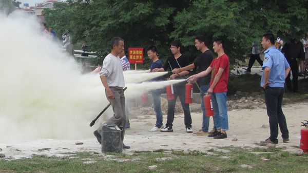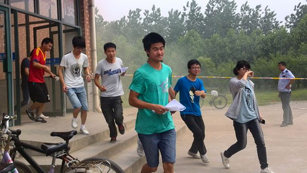 本次演练分为“应急避震”、“紧急疏散”与“灭火实战”三个程序。当尖锐的哨声响起时,应急避震演练也就开始了。安全疏导员迅速到达指定位置,打开教室前后门,并组织学生迅速躲避在课桌下面,双手护住头部,以最大限度的保护自己的生命安全。30秒后,紧急疏散演练开始,安全疏导员立即赶到指定位置维持秩序、引导疏散,根据实际情况帮助学生安全撤离。在三分钟内,180多名学生已安全撤出,并在安全区域清点人数。最后是灭火实战演练,所有参演学生集中到指定场所列队,由保卫处工作人员简要说明消防水枪和干粉灭火器的使用要领,并向同学做相应的演示。接着参演学生代表依次用干粉灭火器扑灭事先设置的燃烧点,通过实练提高实际灭火技能。