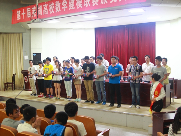 最后,出席本次颁奖典礼的各单位负责人为本次芜湖联赛中获奖的我校一、二、三等奖队伍以及获得2013年全国大学生数学建模竞赛安徽赛区一、二、三等奖队伍和获得2013年 “电工杯”全国大学生电工数学建模竞赛二、三等奖队伍颁奖。