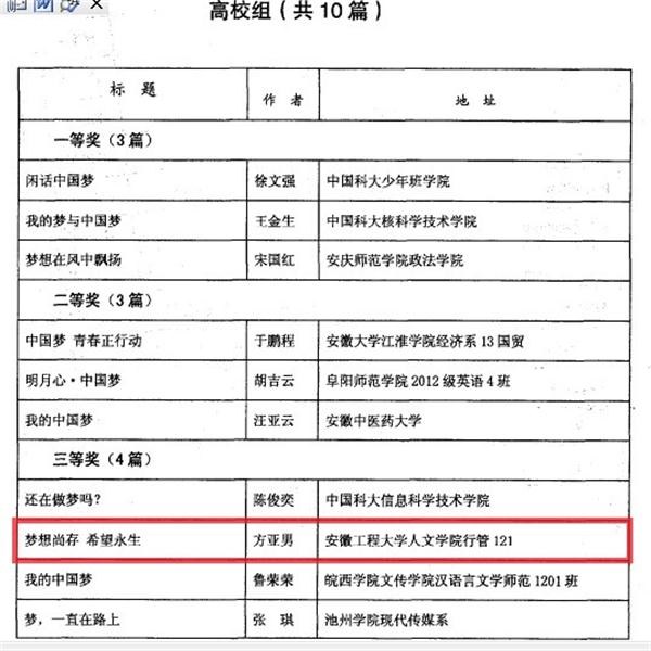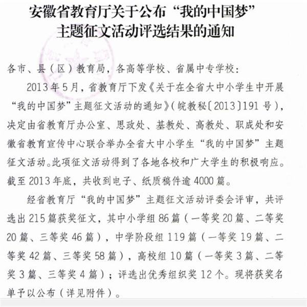 “我的中国梦”主题征文活动由省教育厅办公室、思政处、基教处、高教处、职成处和安徽省教育宣传中心联合举办,在全省大中小学生中开展,截至2013年底,共收到电子、纸质稿件逾4000篇。经省教育厅“我的中国梦”主题征文活动评委会评审,共评选出215篇获奖征文,其中高校组10篇(一等奖3篇、二等奖3篇、三等奖4篇)。