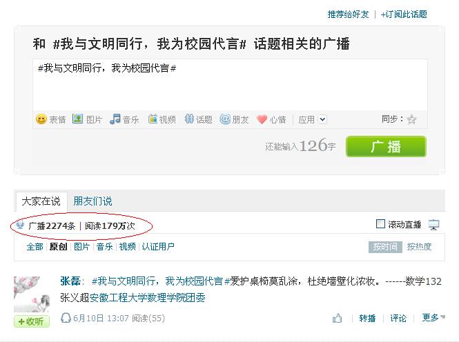 前期,校党委书记陈其工召开专门会议,研究部署校园文明创建工作。党委宣传部、学工部、校团委和校学生会积极行动,组织开展了“我与文明同行,我为校园代言”网络传播活动,用学生熟悉和喜爱的方式,传播网络正能量,加强校园基础文明创建,强化精神文明建设。活动中,全校团属微博发挥整体联动的优势,全天候地转播和评论校团委团属微博发布、展示或转播的有关“我与文明同行,我为校园代言”的图文信息,在全校范围内形成学文明、讲文明的新风。全校团员青年通过团属微博发布#我与文明同行,我为校园代言#原创话题2274条,总浏览量达到179万人次,在网络上形成了强大的正能量。线下共1200余名同学积极参与文明代言活动,共同声讨不文明现象,书写文明代言承诺。