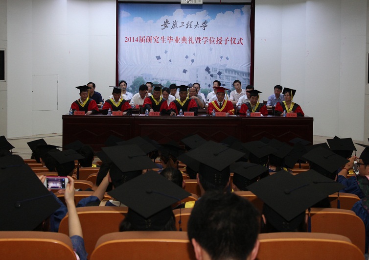 毕业典礼在庄严的国歌声中开始。李震宣读了学校授予2014届研究生硕士学位的决定。校领导给获得硕士学位同学颁发学位证书并扶正流苏。接着,副校长叶常林宣读学校2014届优秀硕士学位论文评选结果、2014年安徽省品学兼优毕业生表彰文件。学校领导为2014届优秀硕士学位论文获得者和2014年安徽省品学兼优毕业生颁发荣誉证书。导师代表刘军教授和毕业生代表王英沣同学分别在典礼上作了发言。