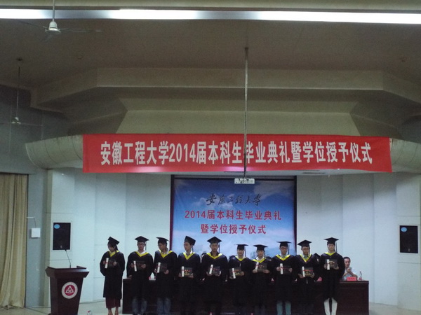 机械学院党委书记邓英扣宣读了机械与汽车工程学院2014届优秀毕业生、安徽省品学兼优毕业生名单,主席台领导为获得表彰的毕业生代表颁奖。