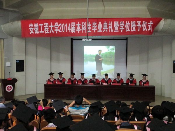 典礼在庄严的国歌声中拉开帷幕。副院长刘军首先宣读了《关于授予2014届本科毕业生学士学位的决定》。随后,在主席台就坐的领导和导师为参加典礼的全体毕业生颁发毕业证书、学位证书并扶正流苏。党委副书记章靖平宣读了《关于关于表彰2014年安徽省普通高等学校品学兼优毕业生和2014届优秀毕业生的决定》,主席台上的领导为受表彰的毕业生颁奖。