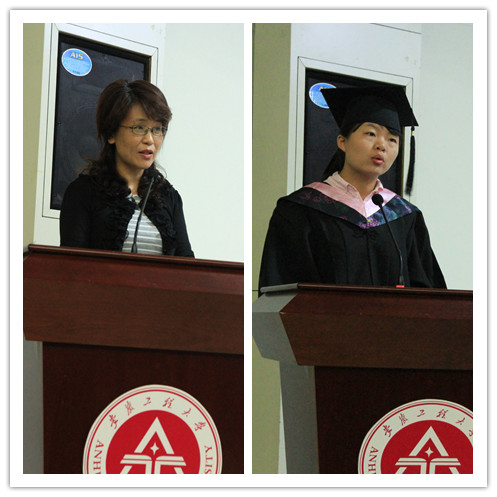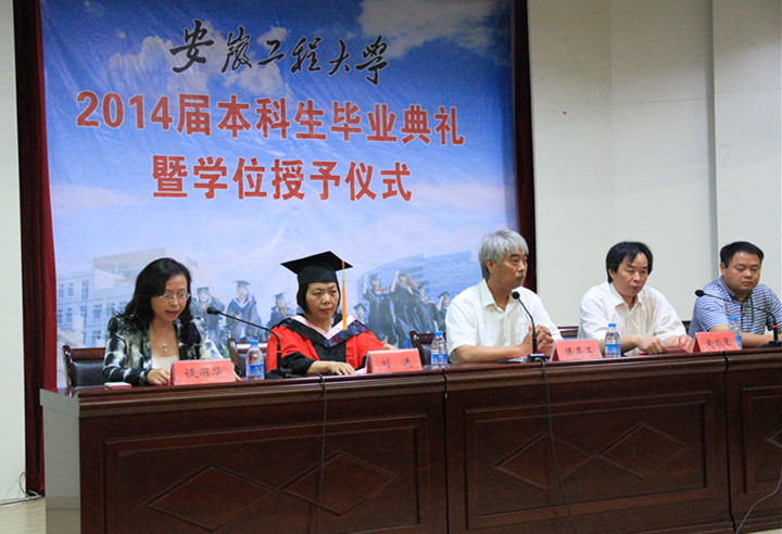 典礼在庄严的国歌声中拉开帷幕。院长刘进宣读了授予2014届毕业生学士学位的决定;院学位委员会主任、院长刘进为毕业生扶正流苏;院党委书记金成星宣读了获得学校2014届优秀毕业生和安徽省2014年品学兼优毕业生表彰决定及名单;主席台就坐的领导为获得表彰的毕业生颁奖;教师代表张曙望副教授和毕业生代表英语101班吕婷同学作了发言。