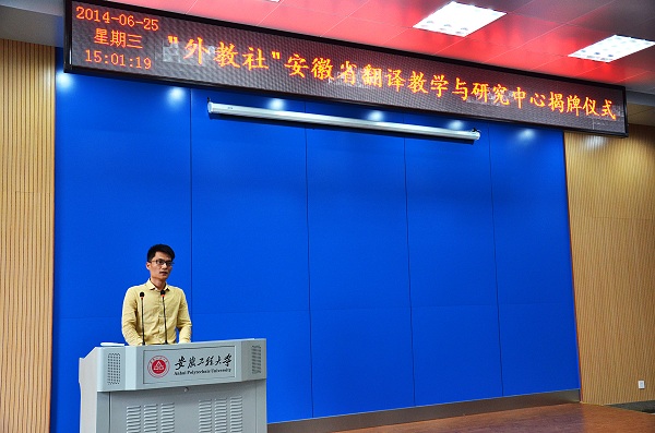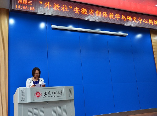 徐君代表外教社致辞,他指出近五年来安徽工程大学外国语学院在办学层次、教学和科研水平等各方面成绩显著,在安徽省外语界有目共睹,值得我们进一步深入交流与合作。上海外教社是一家全国最有影响的大型外语类出版机构之一,拥有丰富的国内外外语教学和研究资源。我们与安徽工程大学合作建立该研究中心,不仅可为安徽工程大学翻译教学与研究搭建平台,更重要的是可以实现全国优质资源的有效整合,为广大教师和研究人员之间的交流提供更好的服务,以期更好的回馈社会。外教社将为研究中心提供专家支持、经费支持、图书支持和项目支持。徐君指出研究中心揭牌是校企合作项目启动的第一步,今后要在双方共同努力下,把研究中心的各项工作落实到位,实现优势资源的整合与最大化利用,为翻译教学和研究工作做出贡献。