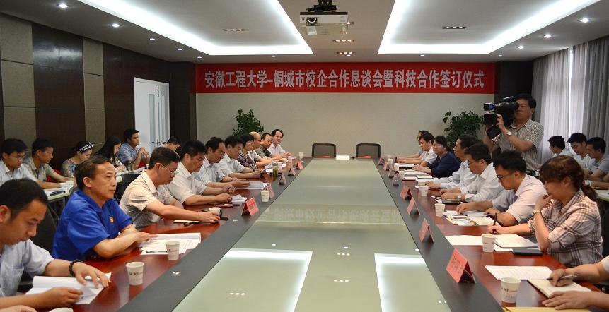 27日上午,双方举行了“安徽工程大学—桐城市校企合作恳谈会暨科技合作协议签订仪式”。副校长李震、桐城市委副书记陆应平、副市长付伟及学校科技处、相关学院教师、桐城市科技局及桐城市20余家企业参加了对接会。