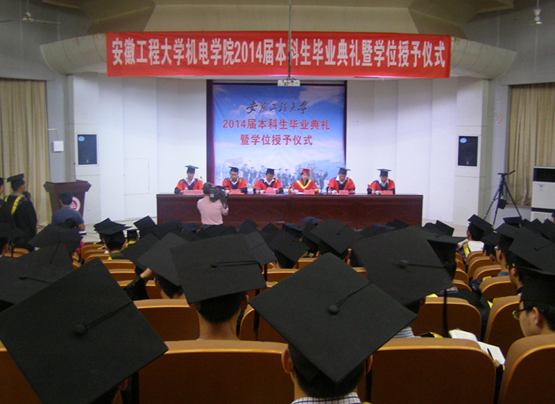 近日,安徽工程大学机电学院2014届本科毕业典礼暨学士学位授予仪式在学术报告厅成功举行。安徽工程大学党委副书记苏国红,教务处处长陶庭先,数理学院党委书记、学生处处长张开炳,总务处处长、机电学院副院长张国友,人文学院党委书记伊长文,机电学院党委副书记郭全根,学院各部室负责人、教师代表、全体毕业班辅导员和毕业生代表共300余人参加典礼。典礼仪式由学院党委副书记郭全根主持。
