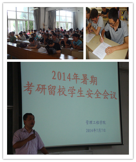 会议首先组织全体留校学生认真学习了《管理工程学院关于2015年考研学生暑期留校工作的补充规定》,并要求留校同学严格遵守学校各项规章制度,切实保护好自身人身及财产安全,不酗酒,不到江、河、湖、塘等没有安全保障的水域游泳,注意交通安全、饮食安全,防盗防骗;同时要认真遵守假期作息时间和学生宿舍管理的相关规定,不违章使用电器,不私自调换床位,不留宿校外人员及未办理假期留校申请的同学,因事外出要向辅导员或者专业负责人登记备案。会议还就暑期留校专业负责人、“日报制”等作出布置,要求负责人要及时关注同学去向,以便学院及时掌握学生信息。