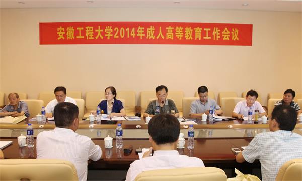 安徽工程大学2014年成人高等教育工作会议于7月23日在芜湖召开。学校党委副书记苏国红、办公室主任王弘、教务处副处长张春,继续教育学院相关人员及各函授站(点)、自考点负责人出席会议。会议由继续教育学院院长朱尚玉主持。