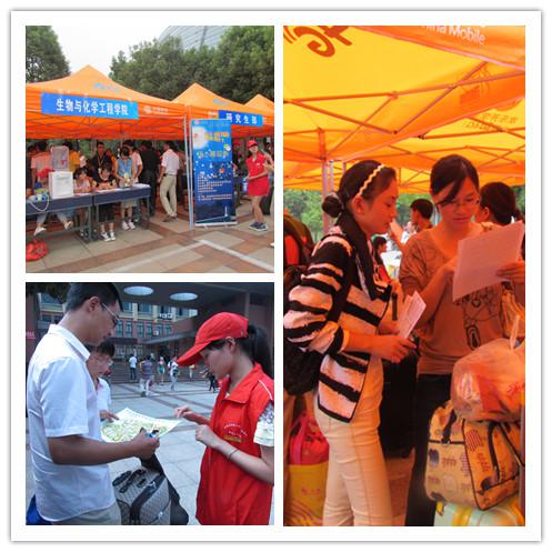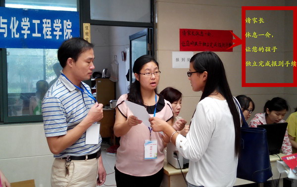 在现场给新生发“新生家长学校联系卡”、“致家长的一封信”,“新生家长会邀请函”等材料,这是我院迎新工作中一以贯之的传统。我院的“团小薇”则成为本次迎新工作又一亮点,通过二维码的扫描可以进入学院团委微信、微博。此外,报到处一行醒目的大字:“请家长休息一会,让您的孩子独立完成报到手续!”家长对此做法非常认同,加以赞许。