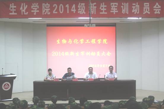 为了让同学们认识军训的意义,积极投身于军训中,生物与化学工程学院2014级新生军训动员大会于9月7日在学术报告厅召开。出席本次动员大会的有生化学院党委书记王弘,生化学院党委副书记章兵及辅导员张宁、孙菲、彭经伟。本次动员大会由章兵主持。